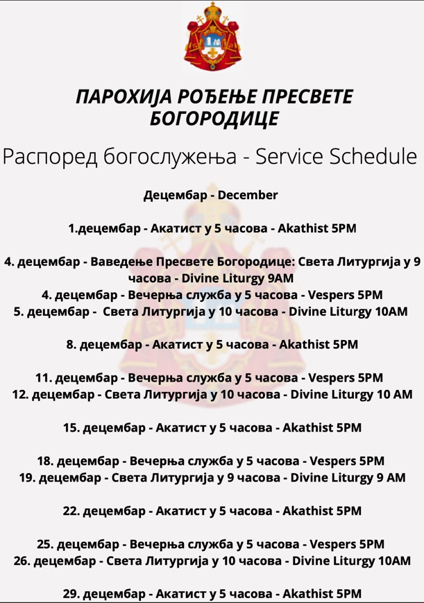 Распоред богослужења за мјесец децембар – Service Schedule for December Објављено 28 новембра, 2021 аутор: tomicdj d09fd0b0d180d0bed185d0b8d198d0b0-d180d0bed192d0b5d19ad0b5-d0bfd180d0b5d181d0b2d0b5d182d0b5-d0b1d0bed0b3d0bed180d0bed0b4d0b8d186d0b5-9Download Подели ово: Share on X(Отвара се у новом прозору) X Подели на Facebook-у(Отвара се у новом прозору) Фејсбук Свиђа ми се Учитавање... Related