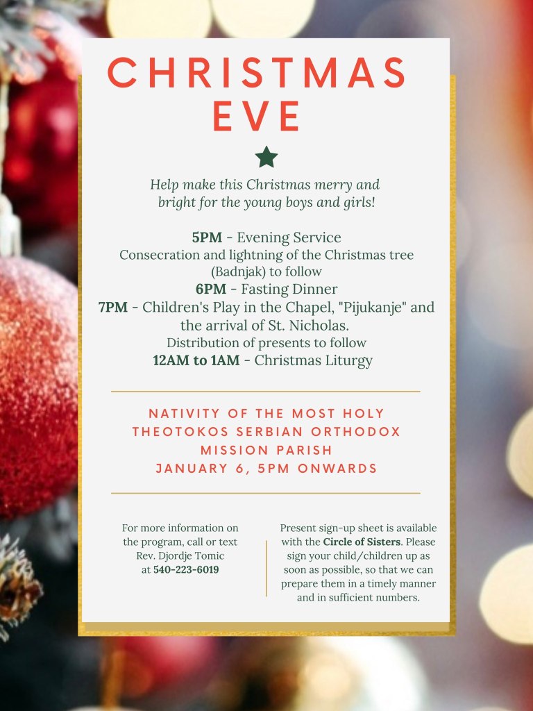 Прослава Бадње вечери и Рођења Богомладенца Христа – Celebration of Christmas’ Eve and Birth of our Lord Jesus Christ Објављено 28 децембра, 2021 аутор: tomicdj Подели ово: Share on X(Отвара се у новом прозору) X Подели на Facebook-у(Отвара се у новом прозору) Фејсбук Свиђа ми се Учитавање... Related