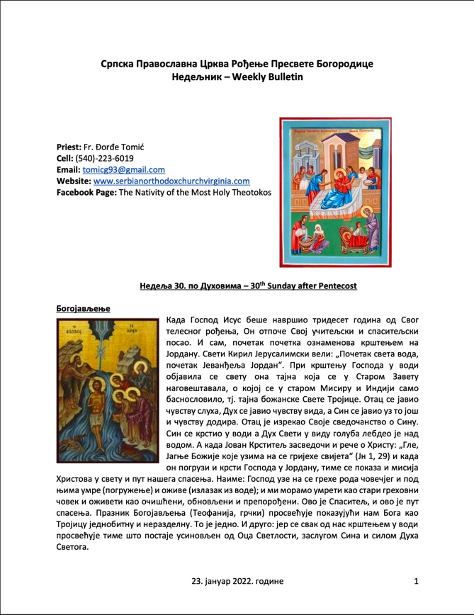 23: јануар: Недељник (Богојављење, Свети Јован Крститељ, Свети Сава) – Weekly Bulletin (Theophany, St. John Baptist, St. Sava) Објављено 22 јануара, 2022 аутор: tomicdj january-23-weekly-bulletinDownload Подели ово: Click to share on X(Отвара се у новом прозору) X Притисни да поделиш на Facebook-у(Отвара се у новом прозору) Фејсбук Свиђа ми се Учитавање... Related