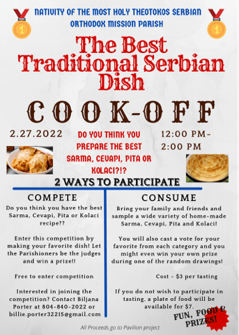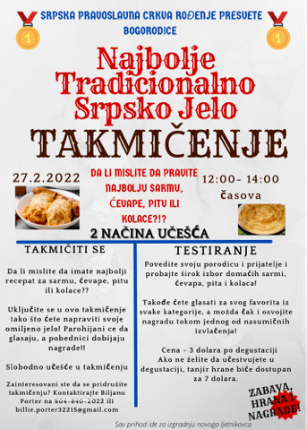 Молимо све заинтересоване да се јаве Биљани Портер (804-840-2022 или путем имејла billie.porter32215@gmail.com) за учешће у такмичењу!